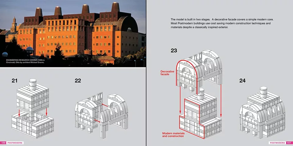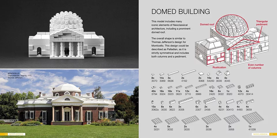 Le istruzioni presenti all’interno del libro utilizzano solo mattoncini bianchi e trasparenti. Ciò semplifica tutto in modo da poterci concentrare sugli elementi chiave di ogni stile. Non eseguite le istruzioni alla lettera, ma utilizzate i colori che avete già, sostituendo i pezzi secondo le vostre necessità. All’inizio di ogni set di istruzioni, vengono elencati i numeri dei pezzi necessari per aiutarvi a ordinare online gli eventuali mattoncini mancanti. Alcuni dei modelli presentati nel libro possono essere costruiti usando i pezzi del Set LEGO Architecture Studi. Gli altri prevedono comunque pezzi comuni, forse già avete.