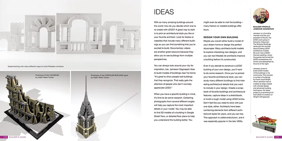 Un vero appassionato di mattoncini di nome Tom Alphin, che di mestiere fa il programmatore presso Microsoft, ha realizzato grazie al set LEGO Architecture Studio e a pochi altri pezzi in aggiunta, repliche più o meno fedeli di 12 celebri edifici. Da questa passione è nato questo libro, intitolato “The LEGO Architect” (tradotto anche in italiano). Il libro copre svariati stili e correnti architettoniche, fornendo le informazioni essenziali sulle principali evoluzioni dell’architettura degli ultimi tre secoli e mettendo a disposizione, in tavole specifiche e nella “Guida del Costruttore”, istruzioni e tanti consigli utili per assemblare i pezzi.